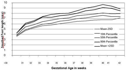 RESULTS The mean foot length of the babies analyzed was 8.03 cm, with the SD of 0.80 cm. It was found that foot length was correlated well with the gestational age. (r = 0.523, p < 0.0001) In the derived normogram based on foot length and gestational age it was observed that there is a linear relationship of the foot length with increasing gestational age. There is increase in the foot length with the increasing gestational age, which started declining after 40 weeks gestations.
