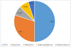 Figure 1: Distribution of CP children according to seizures DISCUSSION In this study majority of patients (52%) were in 2-5 years of age group followed by less than 2 years and more than 5 years. In a study by Kondle et al.7 also showed most patient presented at age of 1-5 years. In our study Male to female ratio was 1.27:1 similar results were seen in Nabanita Das et al.8 In our study, Maternal age (32.14%), severe asphyxia (76.2%), Neonatal hyperbilirubinemia were most common prenatal, perinatal and postnatal risk factor respectively. Similar observation was found in study by Nabanita Das et al.8 and Anant Bendale et al.9 In this study among the spastic group, quadriplegias were 55%, diplegia 22%, monoplegia 1% and double hemiplegia 12%. There are other comparable studies Kondle et al. 7, P.Singhi et al.10, Bendle et al.9 showed spastic cerebral palsy was the commonest type. Study by P. Singhi et al.10 compared two groups of children with CP during two decades, showed quadriplegic CP is most common in their set up with a trend towards increase in diplegic and decrease in the quadriplegic CP. Similarly, Study by Nonica Laisaram et al.11 showed proportion of diplegic has increased being most common spastic type and quadriplegia has decreased showing an evolving clinical spectrum of CP in developing countries. Clinical profile of CP in developing countries is different from that in developed countries. With advancement in maternal and neonatal care and trend of increasing survival of preterm babies in developing countries clinical profile in developing countries is showing a gradual change.11 In our study GMCSF class was used for assessment of motor system. Majority were in class 4 and class 5 (64.2%). Only 15.4% of class 3 followed by class1 and class 2 (10.7%). Similar observation in study by Hongbo Zhang et al.12 showed maximum patient were of class 4 and class 5 (37.5%) followed by class 1,2 (35.5%) and class 3 (27%). GMFCS has been validated as a reliable instrument to classify the severity of gross motor dysfunction in cerebral palsy cases across different age bands. In children with cerebral palsy, health related quality of life is closely related to motor function and intellectual ability. Hence cerebral palsy therapy should focus on restoration of motor and intellectual functions, especially with the goal of being able to live and work independently. It is well known that the early onset of long term regular treatment is pivotal for children with cerebral palsy to obtain a desirable outcome. In our study, Majority were grade I malnourished (55.9%) and grade II malnutrition (29.7%), whereas 3.5% had grade III malnutrition. 10.3% patients had normal nutritional status as compared to study by Singhi Pratibha D et al.10 in which 50.6% were malnourished and 28.1% were severely malnourished. We found 78.5% children had microcephaly and only 21.5% had normal head circumference, whereas study by Singhi Pratibha D et al.10 showed (88.6%) with microcephaly. In this study, 47.6% of children with cerebral palsy in this study had seizure disorder. Among them 50% were generalized tonic clonic seizure, myoclonic seizure (30%), refractory seizure (7.5%), status epilepticus (7.5%) and febrile seizure (5%). In the study done by Singhi PD et al.10 they observed 105 children, 60% of these children with cerebral palsy had seizure disorder. Among them 52.08% were generalized tonic clonic seizure, myoclonic seizure were (20.83%), febrile seizure (12.5%), refractory seizure (8.33%). In study by Delgato et al. 13 reported that focal or secondarily generalized seizures were common in children with CP, whereas primary generalized epilepsies were less frequent. In contrast, Kwong et al.14 demonstrated that generalised epilepsies were less frequently observed in patient with CP, where polymorphic seizure type were more common. Similarly in present study more frequently partial seizure secondarily generalized were observed in CP patient. The presence of neurologic deficits was considered by many authors to be an unfavourable factor in seizure remission. Early prediction of intractable epilepsy would be valuable because rapid identification of patient at highest risk would allow physicians to consider them earlier for treatment with the recently approved medications and other surgical and non- surgical treatments. In this study the majority of patient had a severe form of CP and there is straight relationship between degree of severity and occurrence of epilepsy. Neonatal seizure and positive family history were a common finding associated with epilepsy and it is difficult to have seizure control in these patient. Although none of the patient of this study was submitted to surgery intervention, the new antiepileptic drugs and advances on surgery intervention are promising in improving the care of epileptic children with CP, offering a better quality of life and allowing the integration of these patients and their families in the society.14