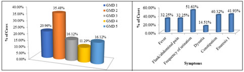 Regarding the degree of gross motor dysfunction, maximum patients (35; 56.45%) had mild dysfunction including 13 (20.96%) with grade 1 and 22 (35.48%) with grade 2. Moderate to severe motor dysfunction was seen in 27 (43.54%) including 10(16.12%) with grade 3, 07 (11.29%) with grade 4, and 10 (16.12%) with grade 5 as depicted in figure 1. For intellectual disability Binet Kamat Test of Intelligence was used, among the 54 children with CP whose ages were between 3 and 18 years, maximum number of children had mild intellectual disability 28 (51.85%) followed by moderate intellectual disability 16 (29.62%) and 10 children had severe disability (18.51%). Figure 1: Distribution of cases according gross motor dysfunction Figure 2: Distribution of patients according to presenting symptoms Most of the patients had symptom of frequency of urination 32 (51.61%) followed by history of constipation and enuresis as shown in figure 2. Table 3 presented urinalyses findings among subjects with CP and which showed urine culture proven UTI in 20 cases. Thus, the prevalence of UTI among children with CP was 32.25%, of them 20.96% (13 cases) were male and 11.29% (7 cases) were female. The maximum number of UTI positive cases were observed in 5-7 years age group (25%) followed by 8-10 years (20%). Table 3: Urinalyses findings among subjects with cerebral palsy