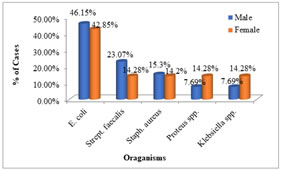 Out of 62 cases, 3 cases had asymptomatic bacteriuria. Thus, the prevalence of asymptomatic bacteruria in children with CP was 4.8%. Of the 07 females examined (UTI positive), 2 (28.57%) had AUTI while 1 (7.69%) of the 13 males had significant bacteriuria. The most common organisms causing UTI in CP children was escherichia coli (45%) followed by Strept. Faecalis isolated in 20% children. From figure 3 it was observed that the escherichia coli were isolated from majority of male (46.15%) and female (42.85%) subjects.