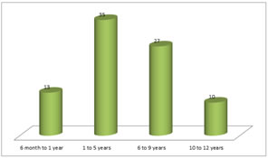 Table-1: Age wise distribution of paediatric patients – 13 (15.2%) patients were between 6 months to 1 year, 35 (41.1%) were 1 to 5 years, 27 (51.7%) was between 6 to 9 years, 10 (11.7%) were 10 to 12 years of age.