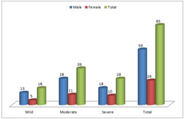 - Table-4: Grades of Anaemia on the basis of haemoglobin level – Mild 13 male, 5 female, total 18 (21.1%), Moderate 28 male, 11 female, total 39 (45.8%) severe 18 male, 10 female, total 28 (32.9%).