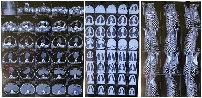 CASE REPORT 11 years old girl presented to us with progressive swelling over the chest and difficulty in breathing on lying down. Born out of a non consangious marriage at a community hospital by vaginal delivery to a 20 year gravida 1 para 0 mother, it was a uneventful delivery, she cried immediately after birth, she has a small swelling over the chest right from the birth, but on intervention was taken on it. The mother was a unbooked case, had two antenatal visits, and had two antenatal ultrasonography done, she did not use alcohol, tobacco or illicit drugs during the pregnancy. She began walking at eight months old, at five years of age she was noted to have a disproportionately short neck, and the swelling over the chest progressively was increasing, but otherwise well developed, no limitation in daily activity. On examination: Short neck. Crab chest noted on the right side. Scoliosis noted. Anthropometry: Height for age: 125.2 cms (below 3rd centile for the age and sex). B.M.I: 13.7 (between 5th and 10th centile for the age and sex). No facial deformity. No other significant findings.