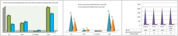 Table 1 Table 2 Table 3 Table 1: Comparison of incidences of diarrhea in interventional and controlled groups from babies 6 to 9 months; Table 2: Comparison of incidences of diarrhea from 9 to 12 months babies interventional and controlled group; Table 3: Comparison reduction of diarrhea cases with previous workers