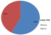 OBSERVATIONS AND RESULTS A total of 250 children in the age group of 6 to 15 years were analyzed. Out of these 144 (57.6%) subjects were males and 106 (42.4%) subjects were females.