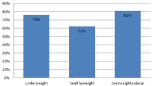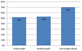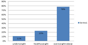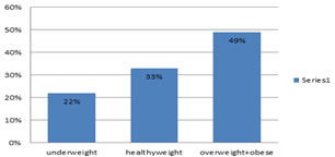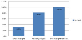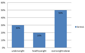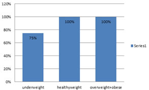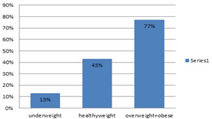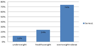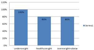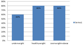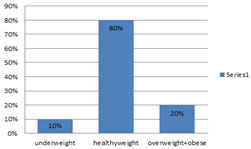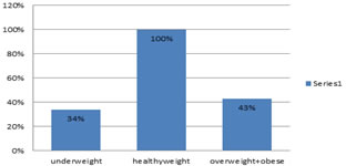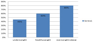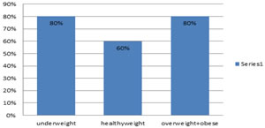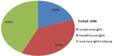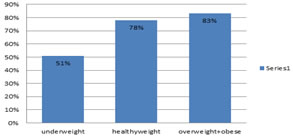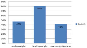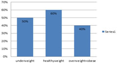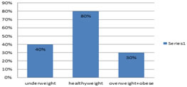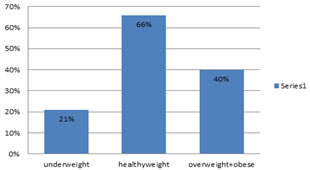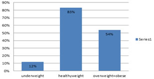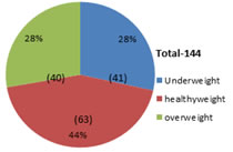 In boy’s category, 41 (28.47%) were underweight, 63 (43.75%) were healthy weight and 40 (27.7%) were Overweight + Obese