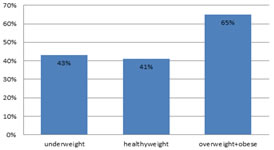 From the above Bar Diagram it has been found that, subjects from healthy weight group have a good habit of eating lot of vegetables which is found to be very less in underweight group subjects and good in overweight and obese subjects.