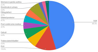 RESULTS The most common impression was vesicoureteric reflux (45.5%) followed by posterior urethral valves(13.6%). diverticula in the urinary bladder (6.8%), trabeculated bladder (6.8%) and calculi (6.8%) were all reported equally. This was then followed by findings of filling defects (4.5%), post void urine residue (4.5%) and a dilated posterior membranous urethra (4.5%). Finally, reduced bladder capacity (2.3%), decrease in calibre of penile urethra (2.3%) and stricture in penile urethra (2.3%) were least reported. Figure 1: MCU findings Most commonly affected age group was 1 - 10 yrs (48.5% of all reported cases), followed by children > 10 yrs (27.3%) and finally individuals between 0 - 1 yr of age (24.2%).