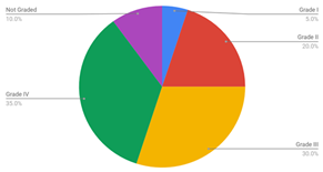 Figure 3: Sex distribution Out of the 45.5% cases of VUR that were reported, 40% individuals were affected only on the right side, 35% were bilaterally affected and 25% of the cases were of left sided VUR. Figure 4: VUR distribution Grade wise distribution of the reported VUR cases is as follows: Grade I: 5%; Grade II: 20%; Grade III: 30%; Grade IV: 35%; Ungraded: 10%. Hence, maximum individuals were affected with a Grade IV VUR. Figure 5: VUR Grading